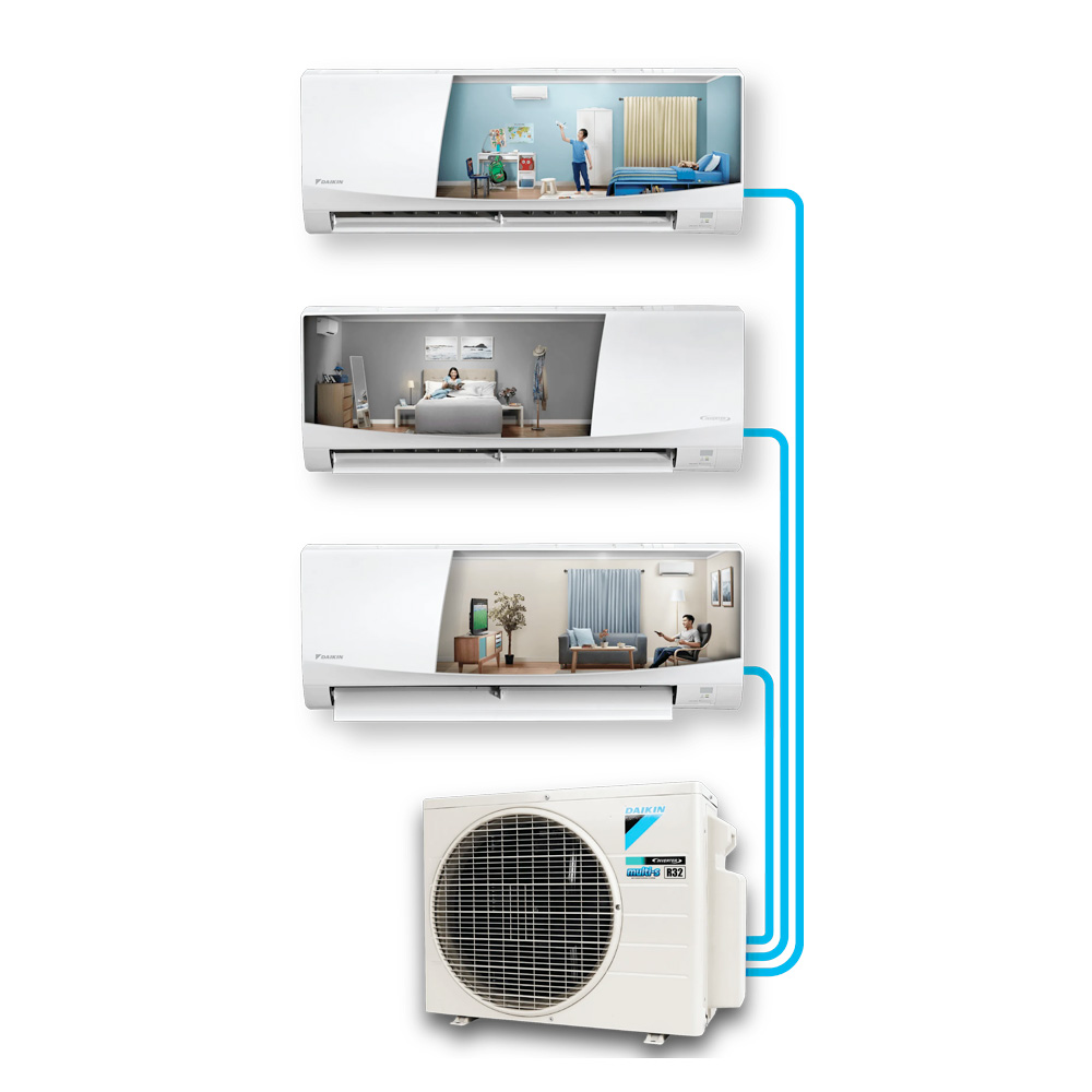 Menjawab kebutuhan akan hunian di Indonesia, Daikin muncul dengan Multi-S 3 koneksi. Dengan 3 keunggulan utama, yaitu hemat tempat, hemat energi dan hemat listrik. Hanya dengan 1 outdoor dapat mengoperasikan 3 unit indoor sekaligus menggunakan daya listrik sebesar 800 Watt (Low Watt Mode, Level 2).