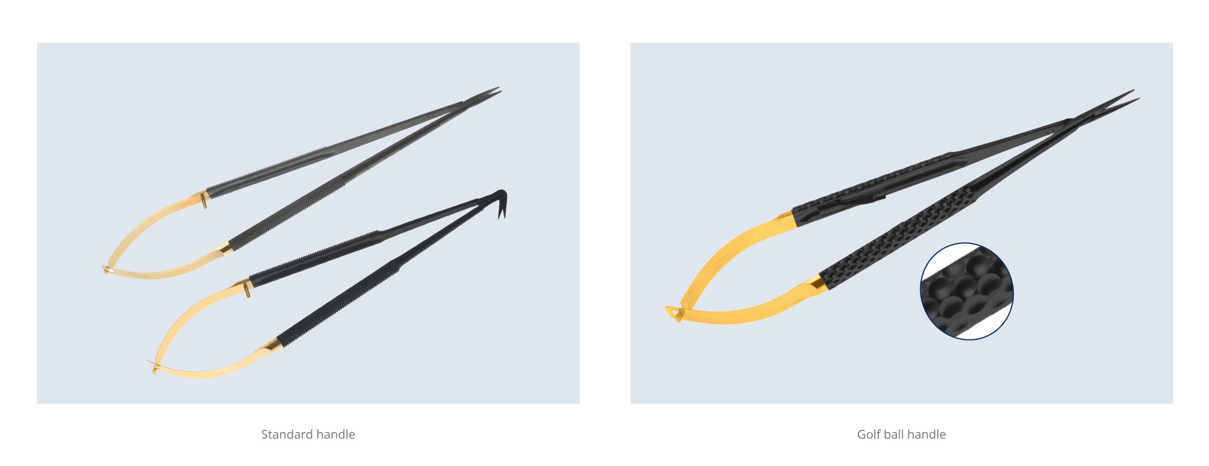 The ANOBILIS product line is characterised by its gold-coloured ring and spring handles and a high-quality black ceramic coating. With their black high-tech coating, these instruments offer you a long working lifetime and minimal optical reflections. We offer ANOBILIS in different handle designs.