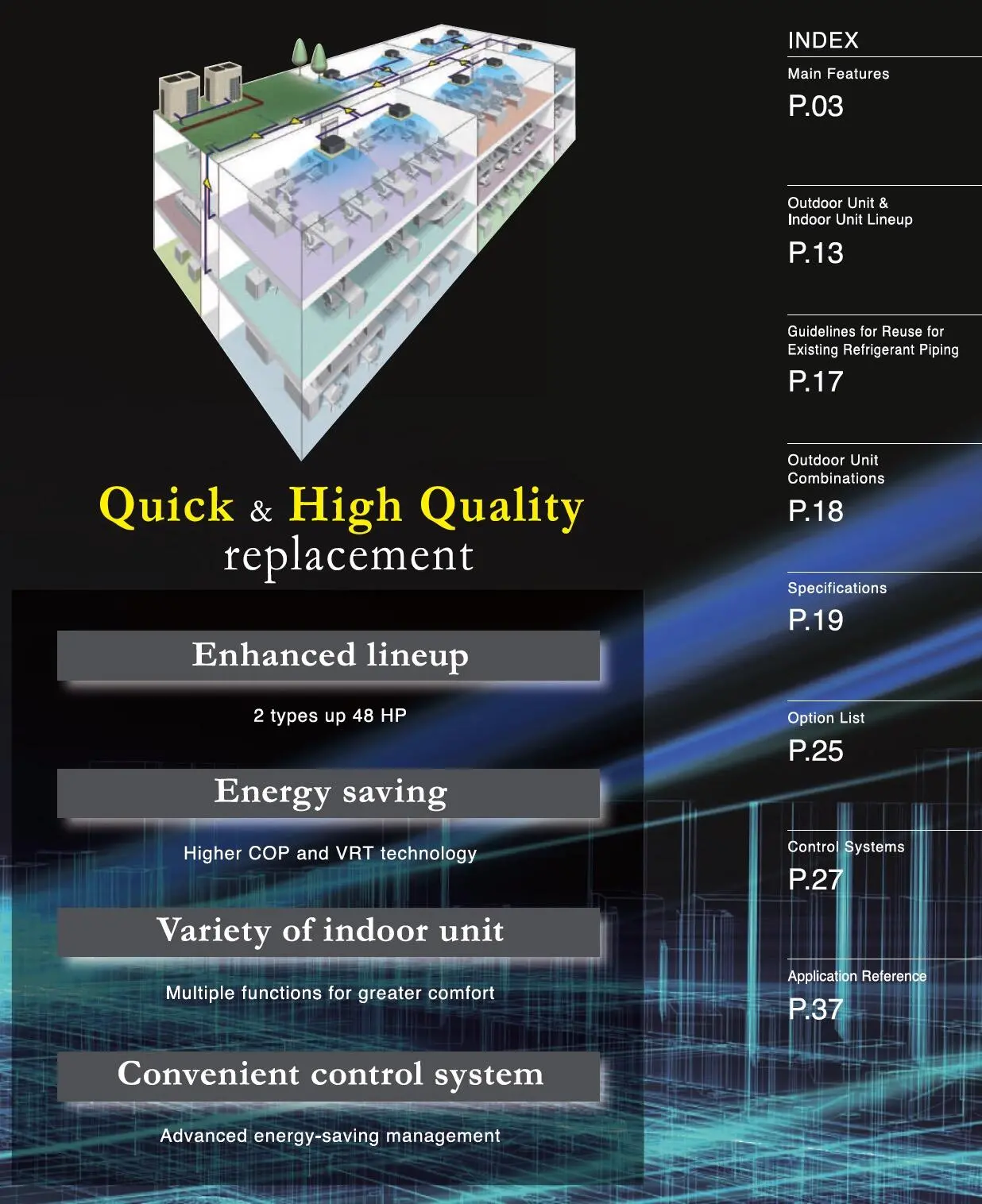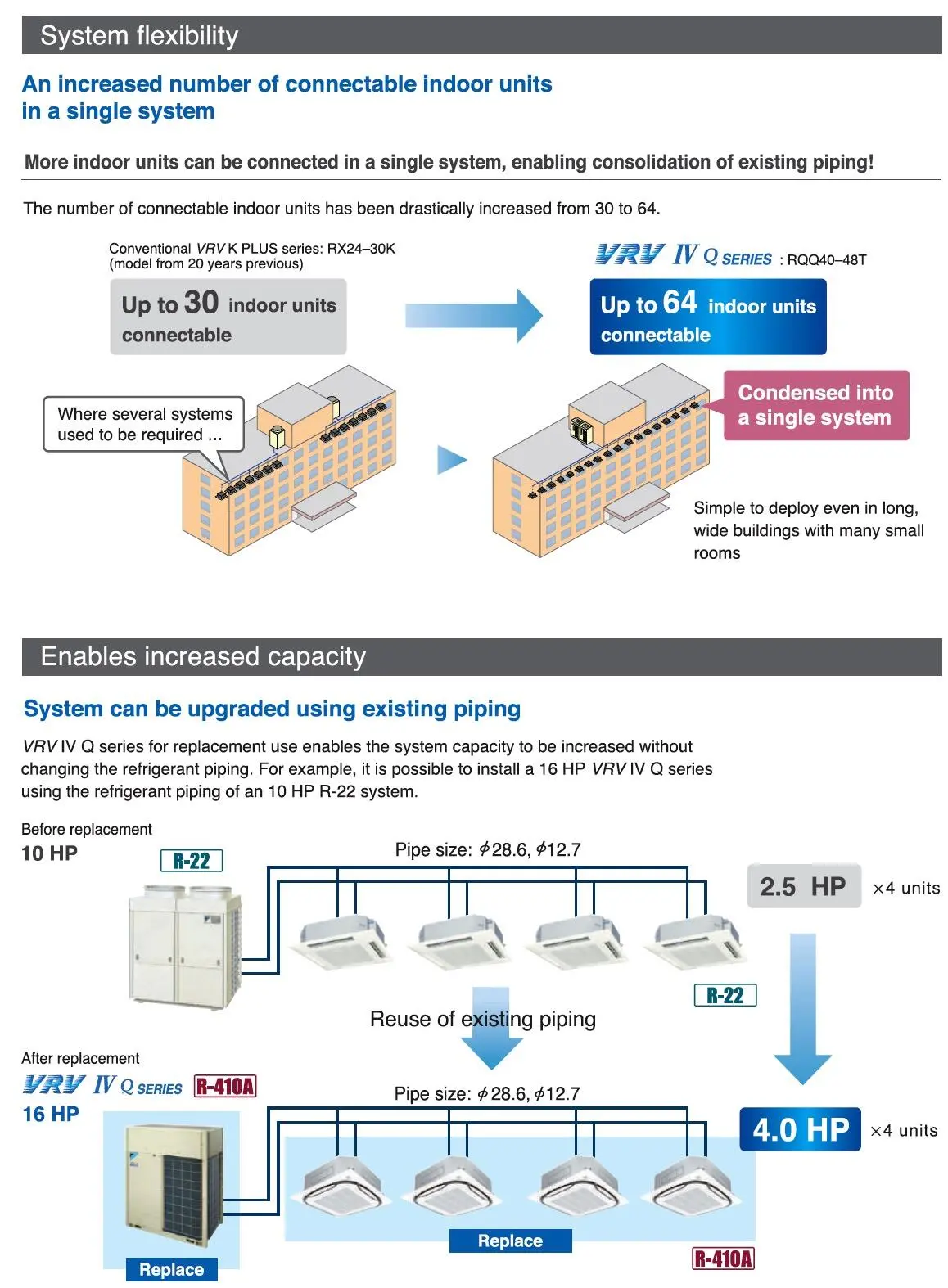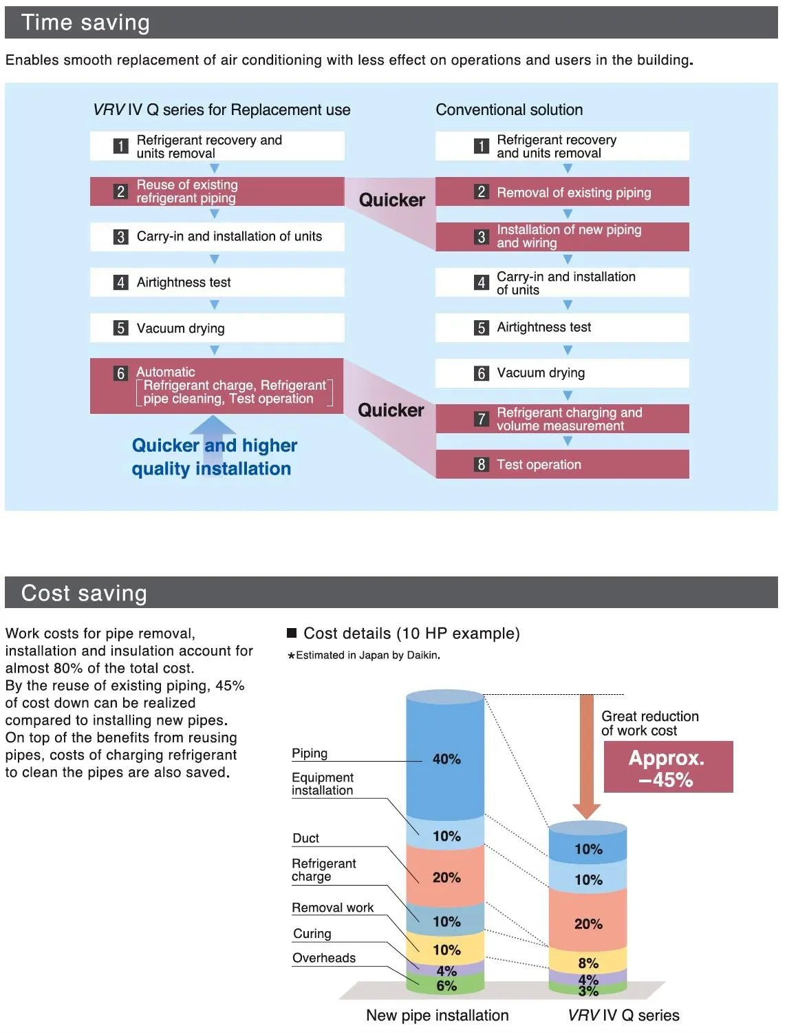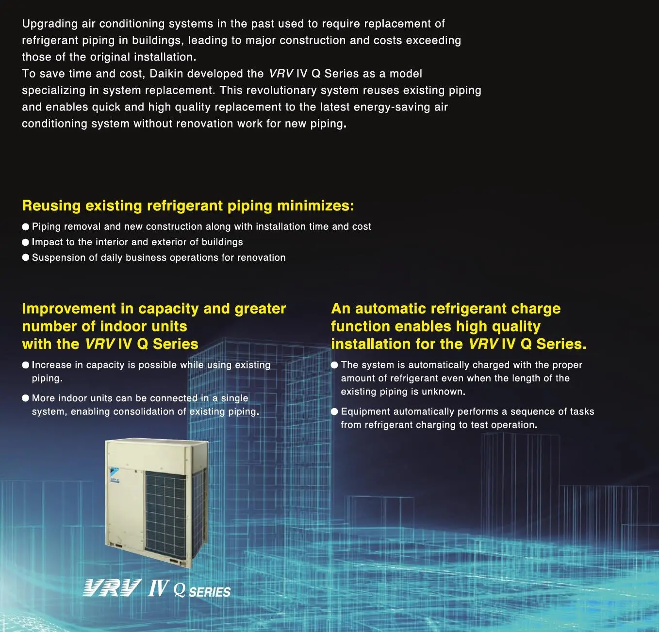 Perbaikan sistem pendingin udara di masa lalu biasanya memerlukan penggantian pipa refrigeran di gedung-gedung, yang mengakibatkan konstruksi besar dan biaya yang melebihi biaya instalasi awal. Untuk menghemat waktu dan biaya, Daikin mengembangkan Seri VRV IV Q sebagai model yang berspesialisasi dalam penggantian sistem. Sistem revolusioner ini memanfaatkan kembali pipa yang ada dan memungkinkan penggantian yang cepat dan berkualitas tinggi ke sistem pendingin udara hemat energi terbaru tanpa perlu renovasi pipa baru.